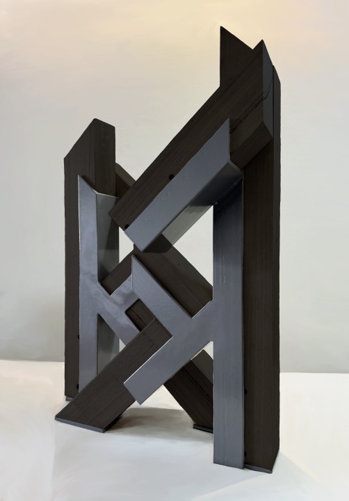 Bonded embrace Bonded embrace explores the relationship and playful connection between two objects. mild steel and reclaimed black butt merge into one form.